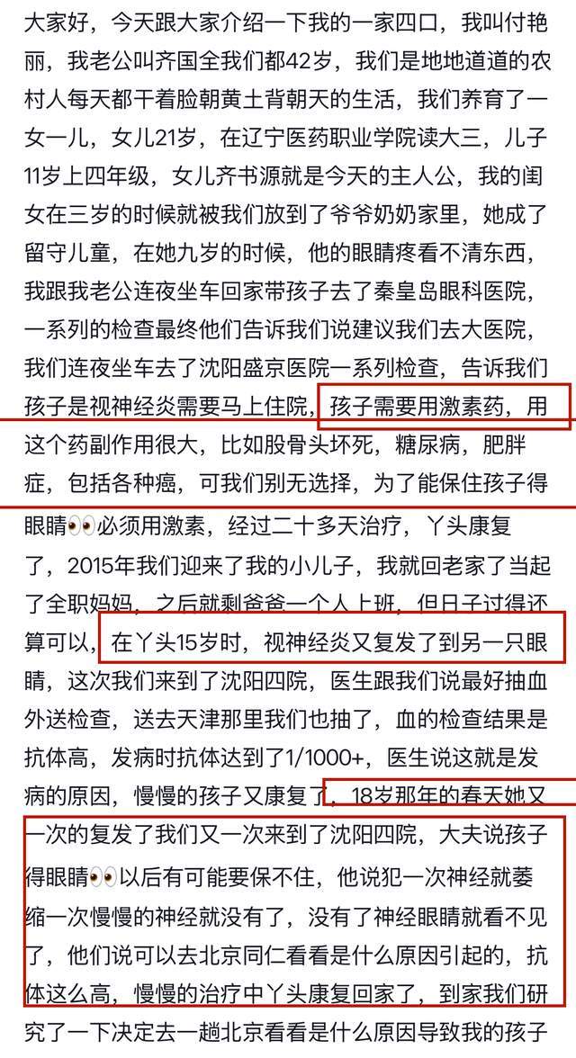 早在去年的时候,齐书源的妈妈就曾分享女儿小时候的经历。因为视神经炎,她曾在九岁的时候住院,虽说康复,但这中间使用了激素药,而这个药的副作用就包括她之后的“结果”。