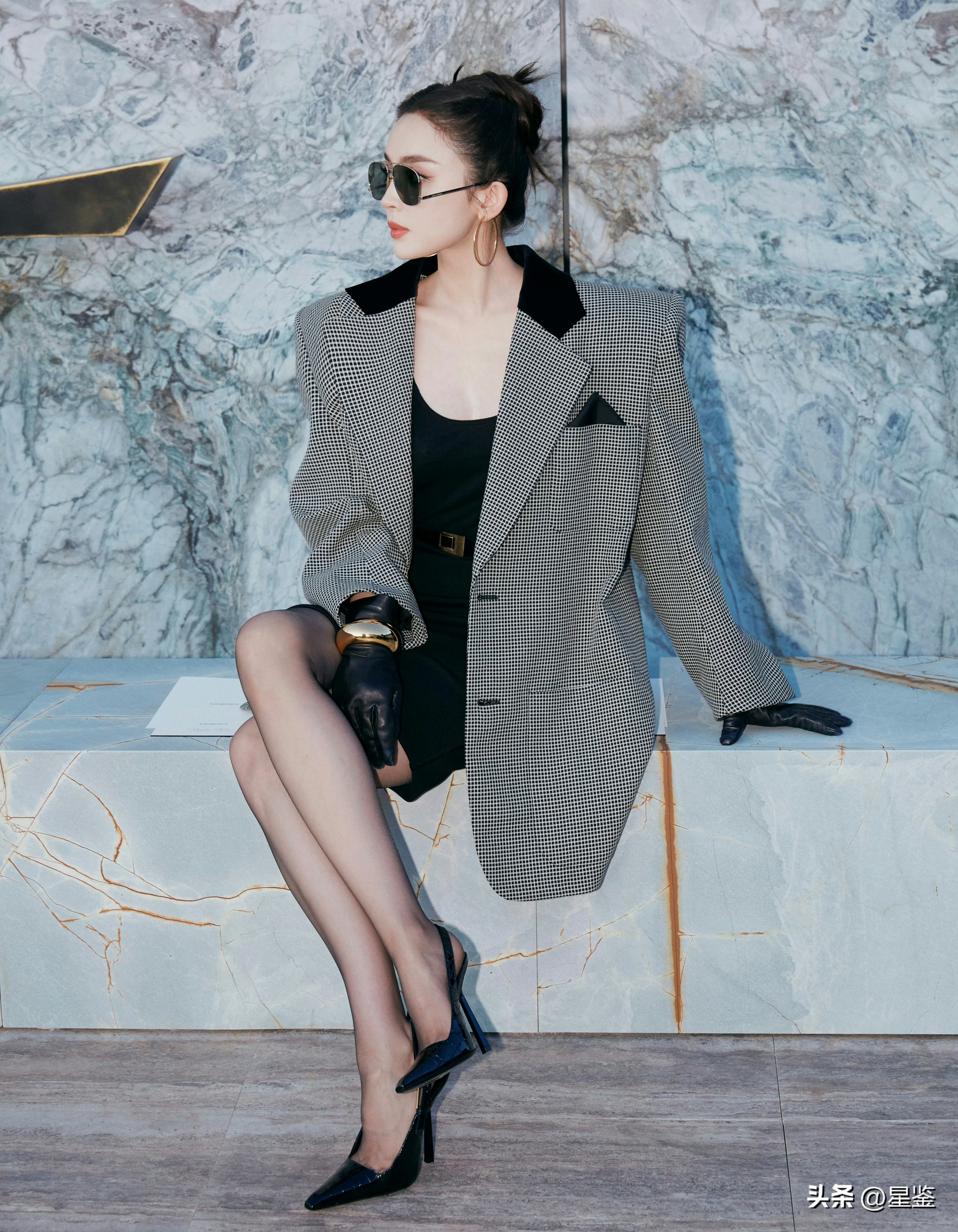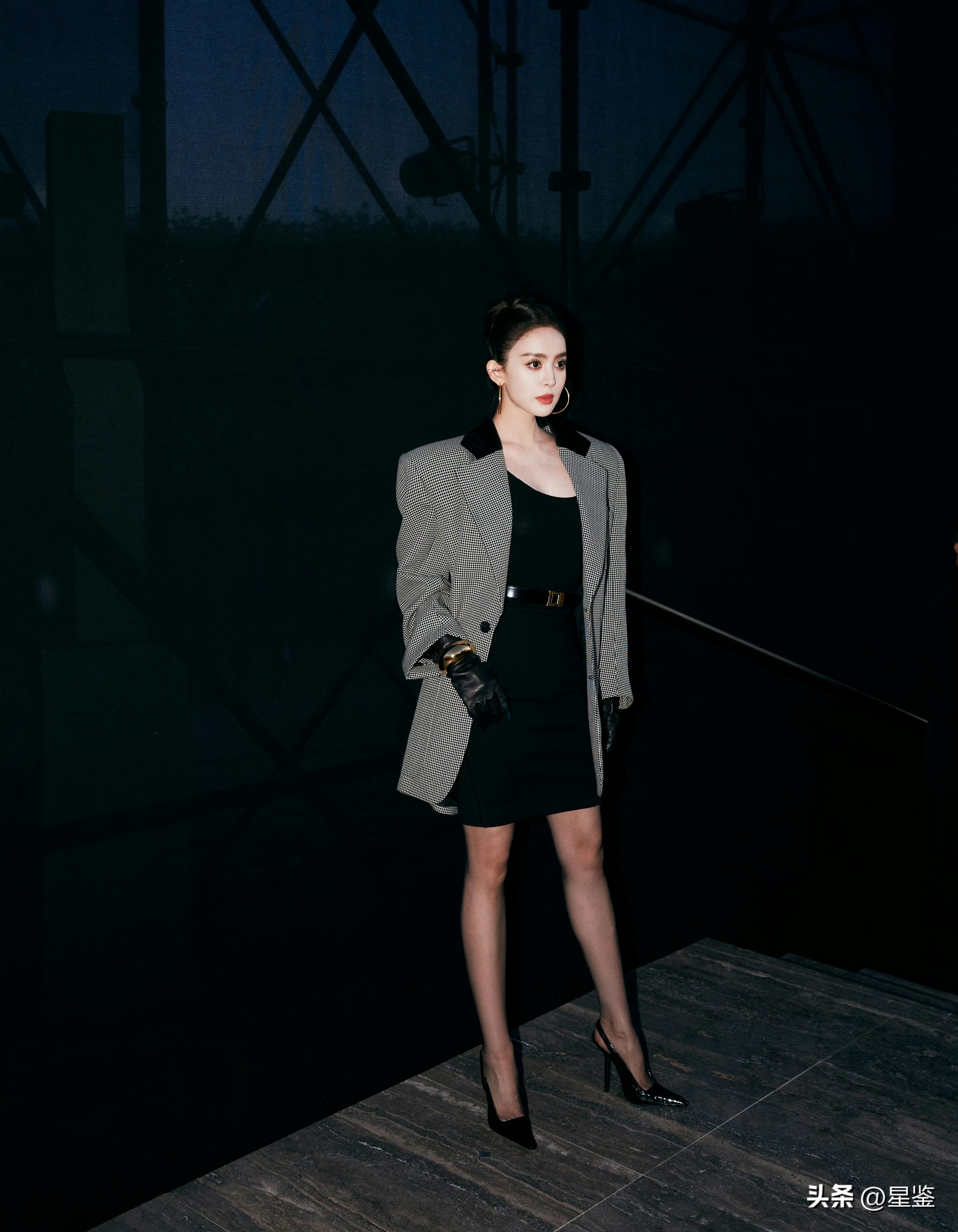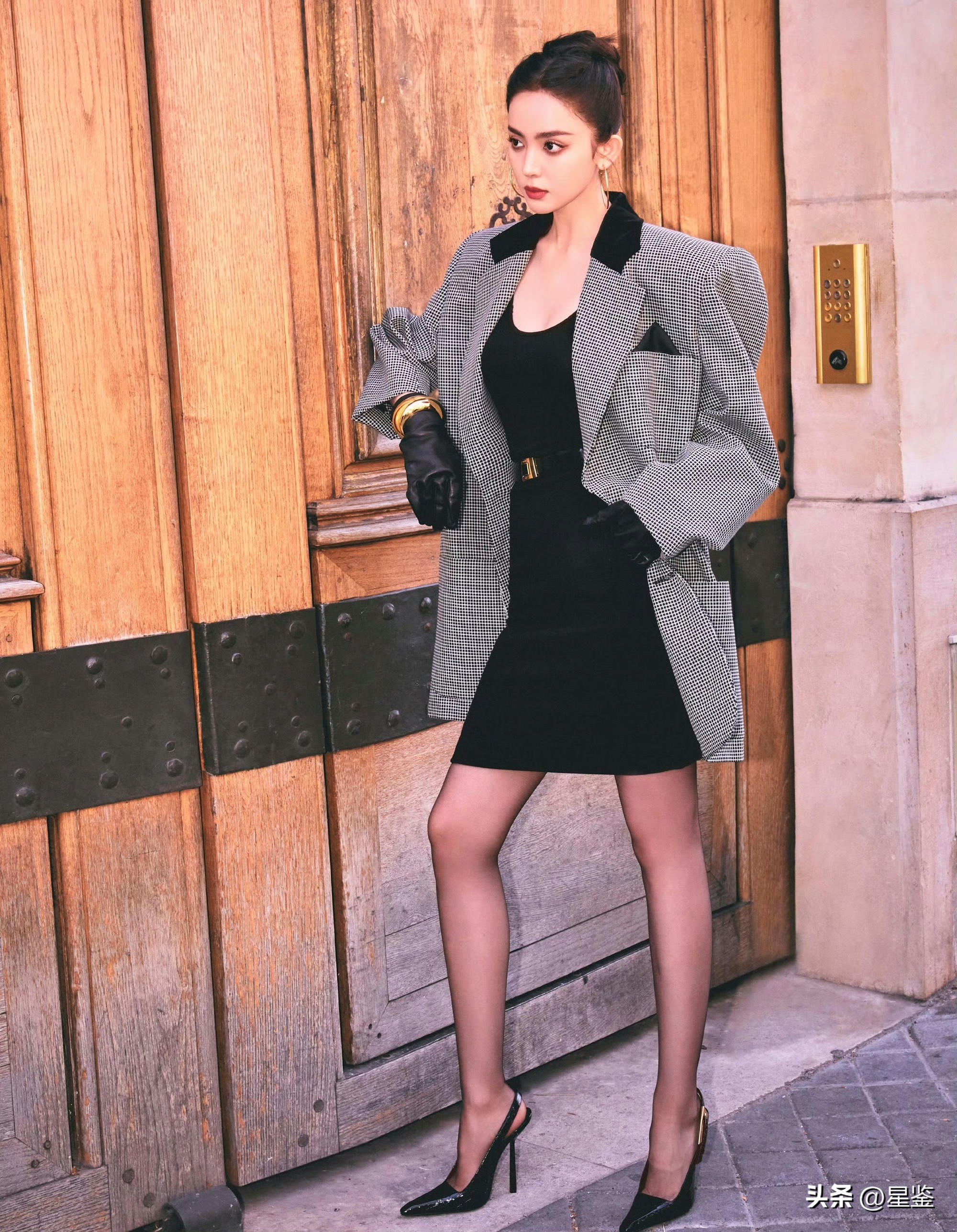 细节才是高级感的灵魂。大圈金耳环拉长颈部线条,黑丝+尖头细跟 slingback 是辣妹标配,既显腿长又添了几分妩媚,皮质手套和金手镯更是点睛之笔,把复古贵气感拉满,连发型都选了利落的高丸子头,清爽又干练,完美适配这套飒爽造型。