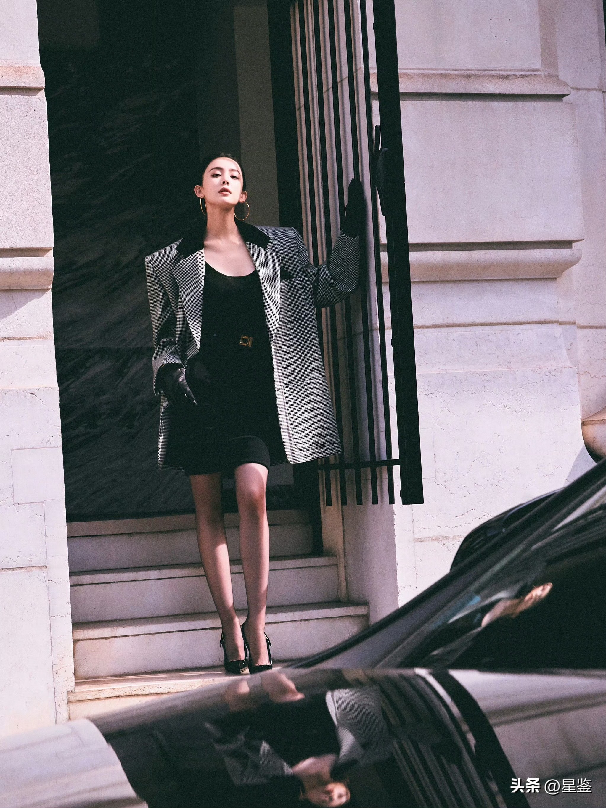 这套造型的精髓,全在「松弛感与力量感的平衡」。一件oversize千鸟格西装是绝对主角,黑白细格纹自带复古滤镜,撞色丝绒领瞬间拉高精致度,夸张的垫肩直接把头肩比拉到完美,气场全开又不会显臃肿。内搭选了极简的黑色修身吊带裙,用紧身款中和西装的宽松,上宽下紧的版型把腰臀比衬得绝了,再用一条细金扣腰带收住腰线,瞬间优化身材比例,172的身高直接穿出超模既视感。