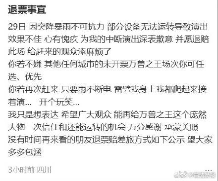 ## 一场暴雨中的"吃瓜":薛之谦演唱会的雷雨惊喜, , 3月31日的早晨,当我打开手机,看到薛之谦在微博上发文回应演唱会退票一事时,我忍不住笑出了声,一个演唱会因为暴雨导致设备故障,这在现代娱乐产业中可谓是家常便饭,但薛之谦的回应,却让这场"吃瓜"达到了一个全新的高度。, ,"29日因突降暴雨不可抗力,部分设备无法运转导致演出效果不佳",这句道歉话语本身已经让人忍俊不禁,暴雨、设备故障、演出效果不佳,这些都是演出中常见的意外因素,但薛之谦却在这里做了一个惊人的转折,他说:"心有愧疚",愿退赔此场并承担差旅,观众可任选其他未开票场次,这简直就是在说:"我承认错了,但我一定会再给大家一个好演出!", , 更让我哭笑不得的是,他在文末还加了一个开玩笑:"只要雨不断电,雷劈我身上我都爬起来接着演",这句话堪称经典,充满了不服输的精神和幽默感,就像是一个在台风中依然坚持演唱的歌手,或者是一个在雷电中不屈不挠的武士,薛之谦用这句话彻底点燃了粉丝们的想象力。, , 这样的回应,不仅展现了艺术家面对困境时的风度,更展现了他对粉丝的珍视和对自己专业的负责,无论是承担退票责任,还是以"雷劈我身上"的搞笑话语来调侃,薛之谦都在用自己的方式告诉观众:"我值得你期待,值得你信赖"。, , 这场"吃瓜"最终给观众留下了两种可能:一种是观众选择退票,另一种是等待下一次的精彩演出,在薛之谦身上,我们看到了一个真实的、有趣的艺术家形象,他用幽默化解了困境,用真诚赢得了观众的理解和支持,这种在危机中保持风度、在挫折中依然保持自信的态度,恰恰是今天娱乐圈最可贵的品质。, , 这场演唱会因为暴雨而被迫中断,成为了一场意外的"吃瓜"大盛宴,无论结果如何,薛之谦的这番回应都让人对他的职业素养和个人魅力又爱又敬,期待下一次,他能带给我们更多这样的惊喜吧!## 一个演唱会的暴雨遇险:当“吃瓜”成为最好的自我救赎, , 3月29日的那场演唱会,像一场突如其来的暴雨,打断了现场观众的期待与欢愉,这场意外的"暴雨",不仅让观众们的演唱会记忆成为了"雨天里的瓜味",也让演唱会主持人薛之谦的"瓜头"被彻底剥开。, ,### 一、暴雨来临:演唱会的"意外剧", 在这个原本期待璀璨星光大道的夜晚,突如其来的暴雨如同一场突袭性的"危机剧",暴雨的狂风暴雨,让整个演唱会的设备"瘫痪",演出效果难以称为"完美",观众们眼中的"璀璨星光",在这场突如其来的"暴雨"后,成为了"乌云密布"。, , 这场突如其来的"暴雨",不仅打乱了演唱会的节奏,更给演唱会主持人带来了前所未有的"挑战",面对突如其来的"自然灾害",薛之谦的表现既让人"心疼",也让人"捧场",他真诚的"忏悔"、负责任的"退票"决定,以及在"吃瓜"时的机智回应,都成为了这场"暴雨"后演唱会的"亮点"。, ,### 二、吃瓜自救:主持人意外的"自我救赎", 面对突如其来的"暴雨",薛之谦没有选择"硬扛",而是选择了一种"吃瓜"的方式,他在"暴雨"来临后的回应中,既展现了"吃瓜"的机智,也体现了"吃瓜"的智慧。"暴雨是自然的调皮猫","只要雨不断电,雷劈我身上我都爬起来接着演",这些话本身就是一场"吃瓜"的"大秀"。, , 这种"吃瓜"的方式,不仅让人"捧场"、"捧腹",也体现了演唱会主持人的"吃瓜"智慧,他的"吃瓜"不是消极的逃避,而是积极的转化,通过"吃瓜"的方式,他不仅化解了突如其来的"危机",还为这场"暴雨"的"瓜味"定下标签。, ,### 三、吃瓜背后的智慧:在意外中寻找机遇, 这场"暴雨"的"吃瓜"表演,实际上是一种"自我救赎"的方式,面对突如其来的意外,演唱会主持人没有选择"自我否定",而是选择了"自我救赎",通过"吃瓜"的方式,他不仅化解了"危机",还在观众心中"打了个哈欠",留下了"好记性"。, , 这种"吃瓜"的智慧,值得我们从中学习,生活中难免有意外的"暴雨",关键是如何在"雨中寻找阳光",薛之谦的"吃瓜"表演,给我们提供了一个很好的范例:遇到意外时,不妨试试"吃瓜",或许会有意想不到的收获。, , 在这场"暴雨"的"吃瓜"表演中,我们看到了演唱会主持人的"吃瓜"智慧,也看到了他在意外中寻找机遇的勇气,这种"吃瓜"的方式,不仅让这场演唱会"吃出了"新意,也让观众们在"吃瓜"中获得了"瓜味"的快乐,期待下一次的"瓜场",也会是"吃瓜"的绝佳表演。