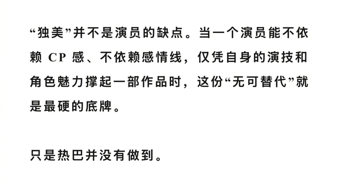 狐厂娱乐观察说迪丽热巴。“独美”并不是演员的缺点。当一个演员能不依赖 CP 感、不依赖感情线,仅凭自身的演技和角色魅力撑起一部作品时,这份“无可替代”就是最硬的底牌。只是热巴并没有做到