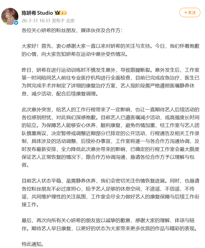 3月31日,陈妍希工作室发文,称昨日陈妍希在进行运动训练时不慎发生意外,导致跟腱断裂。意外发生后,工作室第一时间陪同艺人前往专业医疗机构进行全面检查,目前已完成应急治疗,医生已为其完成手术并制定了详细的康复治疗方案,艺人现阶段需严格遵照医嘱静养休息,减少活动,配合后续康复调理。