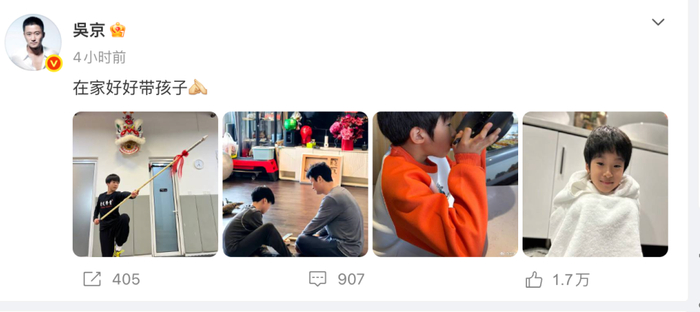 令人意外的是,吴京真的“听劝”了。4月12日,他在微博晒出在家带娃的照片,配文仅7个字:“在家好好带孩子。”照片中,吴京陪着儿子练武、玩耍,画面温馨,荧幕上的硬汉变成了温柔奶爸。