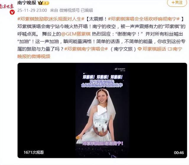 舞台灯光聚焦处,邓紫棋在“I AM GLORIA”巡演南宁站开场时声音哽咽。11月29日晚,这位香港歌手面对上万观众首次披露心迹,连日关注香港火灾新闻令她“心碎”,但更坚定要用音乐为受伤的灵魂筑起避难所。