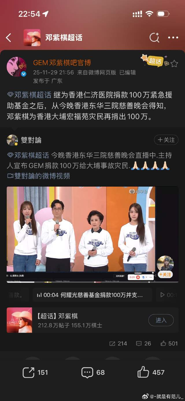 灾难发生后的48小时内,邓紫棋完成两次精准援助。11月28日,她通过仁济医院「紧急援助基金」捐赠100万港币专项支援灾民医疗安置;次日又现身东华三院慈善晚会追加100万港币。这笔累计200万港币的善款背后,是她台前幕后截然不同的两种姿态:社交媒体静默无声,救援行动却雷厉风行。