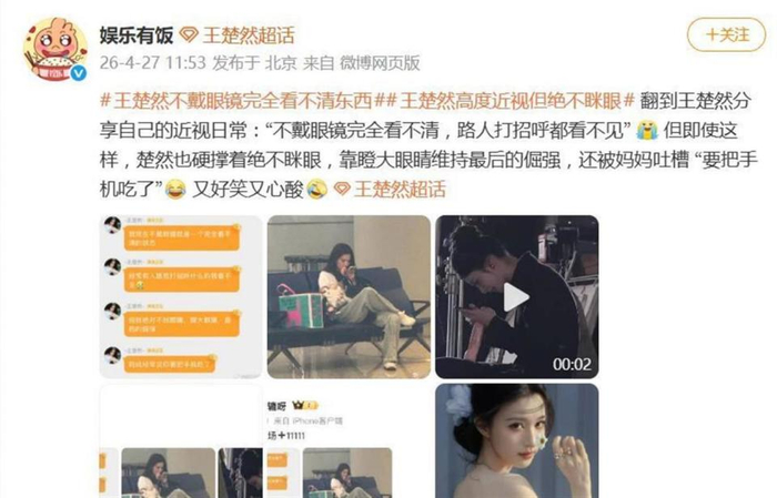 ## 王楚然的600度近视:明星背后的不为人知困扰,也许你也一样,王楚然的日常分享,让无数近视人士直呼“是我本人”,这位被称为“白眼姐”的演员,坦言自己是600度的高度近视,连路人都看不清,手机得“怼到脸上”才能用,王楚然的“硬撑”风格,让她在镜头前掩饰了半辈子的疲惫。,高度近视不仅意味着度数高,更意味着眼轴拉长、眼底薄弱,这种情况下,眼睛容易出现视网膜裂孔等严重问题,面对镜头,王楚然选择用力睁大眼睛来保持神采,试图掩饰不适,这种“硬撑”的姿态,让她在网络上被贴上“翻白眼”的标签,甚至一度成为“白眼姐”的网络黑称,直到2026年,她才真相大白:那些被误解的表情,都是因为眼睛不适导致的生理反应。,王楚然对激光手术的恐惧源于小时候看到的惊悚电影片段,这种心理阴影至今仍在困扰她,现实因素也让她望而却步:近视手术后需要恢复期,期间不能化妆、不能戴美瞳,这对工作繁忙的演员而言,几乎是难以协调的,医学专家指出,高度近视患者更要注意保护眼睛,避免参与剧烈运动。,王楚然的故事像一面镜子,照出了明星背后普通人的一面,她的困扰让无数近视网友感到共鸣,也让人们开始重新审视那些曾经误解的明星表情,高度近视不仅是视力问题,更是一种隐形的困扰,或许你也有类似的经历,眼睛疲劳、看不清东西,甚至被误认为“翻白眼”,在这个光鲜亮丽的时代,不妨多关注自己的视力健康,让每一天都能看得清楚、笑得开心。**王楚然的“半盲”日常:从硬撑到真相大白的励志故事**,演员王楚然的一段日常分享让无数近视网友直呼“是我本人”,她坦言自己不戴眼镜的时候,完全“半盲”,别人打招呼她看不见,手机也得捏到脸上才能用,更可怕的是,她妈妈忍不住吐槽:“你要把手机吃了?”这种场景,高度近视的朋友们都深有体会。,但是王楚然可不像普通人那样无奈,她有一个特别的习惯:即使眼前一片模糊,她也绝不眯眼,Instead,她选择用力睁大眼睛,试图让视线更集中,这种“用瞪眼完成最后的倔强”的精神,既让人敬佩,也让人哭笑不得,用网友的话说,这叫“硬核”。,这个习惯背后,藏着明星的职业压力,在镜头前,眯眼容易被解读为“无神”或“不耐烦”,而睁大眼睛则被认为是更精神、更专注的表现,为了维持荧幕形象,她选择了后者,即便在强光下拍戏或者长时间戴美瞳,她的眼神依然努力保持灵动,这背后全是“硬撑”的功夫。,这种“硬撑”的习惯也给她带来了麻烦,过去很长一段时间,王楚然在公开场合的瞪眼、频繁眨眼等动作,被很多网友截图,打上了“翻白眼”、“耍大牌”的标签。“白眼姐”这个称呼一度成了她的网络黑称,2026年4月27日,随着她亲自下场解释,这场持续多年的误会才真相大白,原来,那些被认为是“不屑”的表情,只是高度近视叠加干眼症导致的生理反应,她看不清楚,眼睛又干涩难受,自然会不自觉地瞪大眼或快速眨眼,很多网友恍然大悟:“错怪她了,原来是真的看不见。”,既然近视这么不方便,为什么不去做个激光手术一劳永逸呢?王楚然的回答很直接:她害怕,她多次提到,自己小时候看过电影《死神来了》里关于眼睛手术的惊悚镜头,留下了深深的心理阴影。“好吓人,我真的受不了。”这种恐惧感,让她至今对手术台望而却步。,除了心理恐惧,现实因素也很关键,作为演员,她的工作节奏快,而近视手术术后需要一段不短的恢复期,期间不能化眼妆、不能戴美瞳,这对于需要连续进组拍戏的艺人来说,几乎是难以协调的,手术带来的不确定性,也可能影响她的工作状态。,医学资料显示,王楚然600度的近视,已经属于高度近视范畴,高度近视不仅仅是度数高,更意味着眼轴被拉长,眼球壁变薄,发生视网膜裂孔、脱离等眼底病变的风险,比普通人要高得多,激光手术可以矫正视力,但改变不了拉长的眼轴和变薄的眼底,这些健康风险依然存在。,对于高度近视者来说,比纠结做不做手术更重要的,是养成每年检查一次眼底的习惯,通过专业的眼底照相或OCT检查,可以及时发现视网膜上的“小洞”或薄弱区域,并用激光进行预防性修补,这能大大降低未来发生严重视力损伤的风险。,王楚然的这次坦诚分享,像一面镜子,照出了明星光环下普通人的一面,她的恐惧、她的不便,让很多有同样困扰的网友感到被理解,网络上的风向也从过去的群嘲,变成了现在的共鸣和科普,大家开始讨论,那些曾被误读的明星表情,背后是不是也有类似不为人知的苦衷。,这件事也让“高度近视”这个健康议题再次被关注,在社交媒体上,不少眼科医生借此提醒,近视超过600度的人,要避免参与拳击、跳水、蹦极、过山车等剧烈或对冲性强的运动,因为这些活动瞬间的压力变化,可能给已经脆弱的视网膜带来致命一击,保护眼睛,需要从了解风险开始。,王楚然的故事不仅让人们看到了明星背后的困扰,也让更多人意识到,高度近视不仅仅是一种视力问题,更是关乎健康和生活的重要课题,希望每个人都能关注自己的视力,及时就医,避免因为视力问题带来更大的健康风险,毕竟,看到美好的事物,才是拥有幸福生活的关键呀!