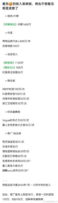 - 美妆与快消品代言700万元:涉足INTO YOU、沪上阿姨等品牌,展现美妆与饮品领域的号召力。
