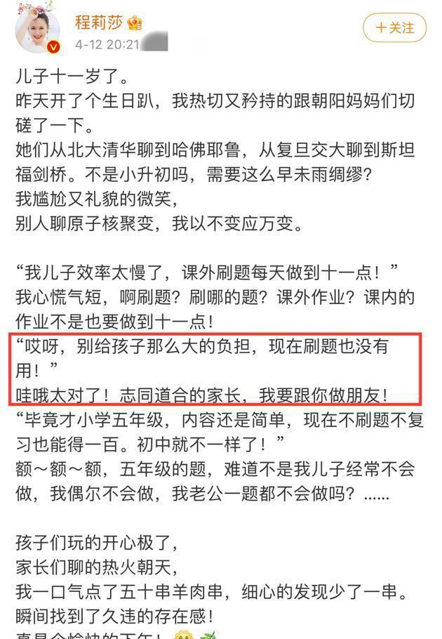 4月12日,女演员程莉莎在社交平台上撰文庆祝孩子11岁生日。她说,她和朝阳区的其他妈妈聊了一段时间,发现大多数家长都希望自己的孩子能成功。在生日聚会上,她听取了大家的意见,但她似乎不想给儿子添太多负担。