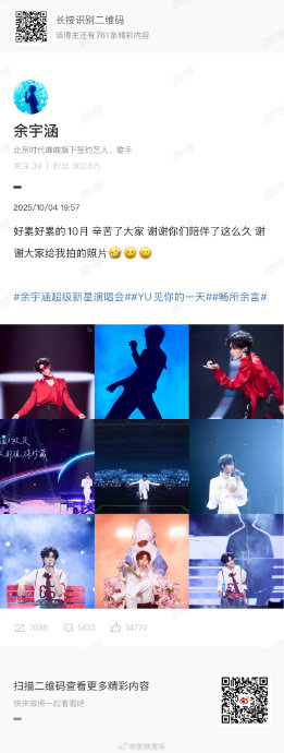 余宇涵的“超级新星”之路,堪称“吃瓜”级大片,2026年4月9日他现身张杰演唱会的画面,简直让人怀疑他是不是打了招呼去当一回路人。,这位“余炒饭”自从2025年10月重庆《超级新星演唱会》落幕后,立刻开了个“巡演之旅”,仿佛连夜赶路的司机,10月底参加宝鸡音乐节,11月就奔赴贵州、无锡等地音乐节,甚至在无锡雪浪音乐节上,余哥哥的《Starlight》《Flower Girl》全程开麦,简直是“封神现场”,粉丝们疯掉了。,跨年期间,余宇涵完全忽略了萎靡的节气,直接冲进大型晚会,12月参加TF家族新年音乐会,随后又在北京卫视跨年晚会和海南新年音乐会中大放异彩,2026年1月,他还参与了微博“跨年直播不断电挑战”,和粉丝一起过了个开心的新年。,2月份,他的状态更是爆表了,在中国电影新春嘉年华上,他献唱了青春满满的《小小世界》,在彩排现场的状态简直是“元气满满”,更有趣的是,他还参加了TF家族“荣耀之战”演唱会,在澳门的舞台上和队友们一起演唱《表白》,虽然后台有点情绪波动,但队友们的安慰让他笑得更开心。,除了舞台,余宇涵在综艺和音乐作品上也没闲着,2025年10月演唱会后,他迅速出发录制了综艺《一路繁花2》,并在节目中从“老师”变成“老板”,虽然有点紧张,但也很新奇,音乐方面,他从2025年12月开始筹备新歌《Pandora》,到2026年3月已经学会了歌曲,新歌即将发布。,粉丝们的日子也不至于没事,余宇涵还在2025年11月24日举办了生日直播,和粉丝一起过生日,2026年3月底至4初,粉丝们还联合发起了包括“膜法世家”专链在内的活动,余宇涵的周边也迎来了最新打样。,最近最火的是4月9日,他被偶遇张杰的巡演,现场沉浸式听歌,还被张杰邀请上了舞台小火车互动,虽然中间因专注和镜头互动差点摔倒了,但这“可爱”瞬间被粉丝们传播开来,媒体还称之为“梦幻联动”,从2025年的个人演唱会到2026年的多栖发展,余宇涵用密集的行程和高质量的舞台,诠释了什么“超级新星”的成长之路,他在音乐、影视领域的表现值得期待,相信余宇涵会继续带给我们更多惊喜。**余宇涵:娱乐圈的“工作狂人”与“全能王者”** ,余宇涵,这位被称为“新生代实力偶像”的小鲜肉,最近的工作节奏可真让人捧腹!自从2025年10月在家乡重庆圆满落幕《超级新星演唱会》后,这位“超级新星”非但没有选择好好休息,而是直接开启了新一轮的巡演与音乐节之旅,几乎每月一场音乐节,舞台上的他从温润的《江南》到潮酷的《TOOOOO BUSY》,风格跨度极大,唱功稳定,全程开麦,粉丝们直呼“封神现场”! ,跨年期间,余宇涵的工作重心明显转向了大型晚会与主流舞台,他不仅在TF家族新年音乐会上全开麦演唱《STARLIGHT》,被称为“仙子般”的造型和“骨相美学范本”,还在北京卫视跨年晚会、海南新年音乐会中亮相,随后还参与了微博“跨年直播不断电挑战”,和粉丝们一起欢度新年,2026年2月,他的状态更是满满元气,在中国电影新春嘉年华上献唱青春歌曲《小小世界》,在彩排现场展现出充沛的活力,同期,他还参与了TF家族“荣耀之战”演唱会,在澳门舞台上与队友们共同呈现《表白》,即便后台情绪波动时,也能得到队友的安慰,展现了他与团队深厚的情谊。 ,除了舞台表演,余宇涵在综艺和音乐作品上也表现不凡,他在2025年10月演唱会后迅速出发录制了综艺《一路繁花2》,三天行程虽然紧凑,但充实度满满,在节目中,他从“老师”变成“老板”的角色转换,既紧张又新奇,音乐作品方面,他从2025年12月至2026年1月期间,参与了新歌《Pandora》的图频拍摄,粉丝们整理的时间线显示,他已经学会了这首曲目,暗示新歌即将问世。 ,粉丝互动方面,余宇涵从不忘记与粉丝保持联系,他在2025年11月24日举办生日直播,与粉丝共度特别时刻;2026年3月底至4月初,多个粉丝职能站联合发起了包括“膜法世家专链”在内的联合活动,他的官方周边“鱼国痛2.”也在4月4日迎来了最新打样,最近的热度高峰出现在2026年4月9日,他被偶遇现身张杰“未·LIVE 开往1982”巡回演唱会,现场他沉浸式听歌,还被张杰邀请登上舞台小火车互动,期间因专注与镜头互动差点摔倒的可爱瞬间被广泛传播,这一举动被媒体称为“梦幻联动”,他在路人镜头下的状态轻松,玩得十分开心。 ,从2025年的个人演唱会到2026年的多栖发展,余宇涵用密集的行程和高质量的舞台,诠释了“超级新星”的成长之路,无论是音乐节、综艺、电影、跨年晚会,还是与粉丝的互动,他都表现得淋漓尽致,仿佛在用自己的努力诠释“全能王者”的称号,他在音乐与影视领域的表现依然值得期待!