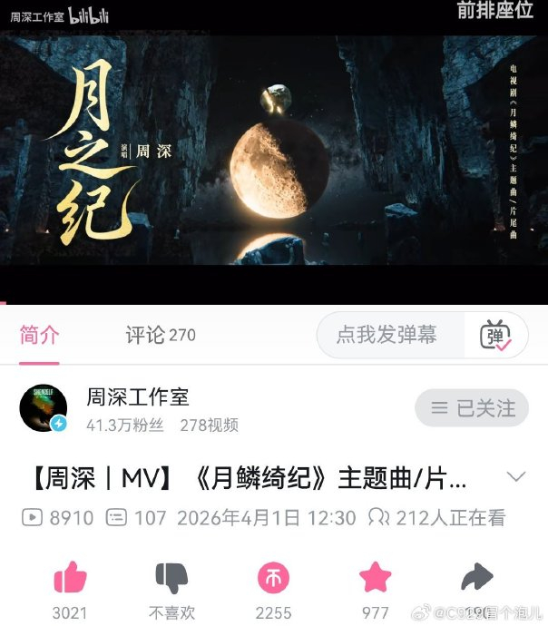 周深空灵嗓音强化《月之纪》的仙侠宿命感,被赞“唱尽九尾狐的灵动与龙族隐忍”;