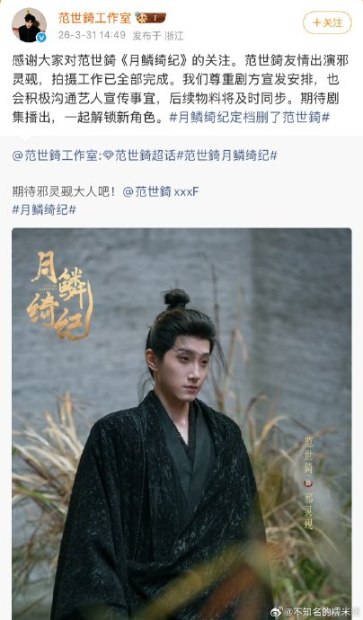2026年3月31日,《月鳞绮纪》官宣定档次日开播,网友对比2025年4月的杀青公告发现:原列为“第二单元友情主演”的范世锜及其角色“邪灵觋”信息,在定档海报及演员名单中被彻底删除。然而同步释出的预告片显示,范世锜的镜头、台词均未删减,面部无任何技术处理痕迹。其工作室次日声明进一步证实,戏份拍摄早已完成且“正片中完整保留”,仅表示“尊重剧方宣发安排”。这种“戏份在、宣发无”的割裂现象,被观众称为“隐形演员”操作。