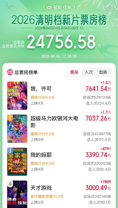 电影《天才游戏》在零宣发、零路演的极端条件下,上映仅3天(截至2026年4月6日16:49)累计票房突破3000万元,成为清明档以小博大的现象级案例。