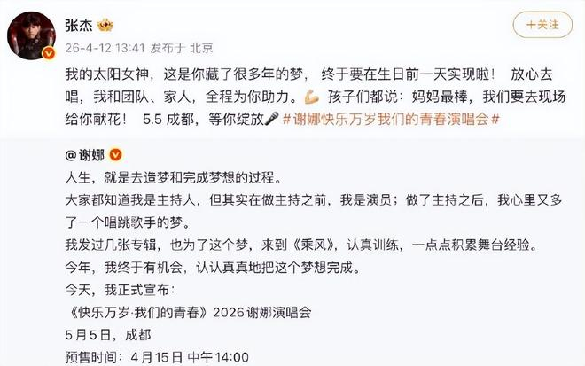 还有张杰确认出席谢娜演唱会,发文力挺:放心去唱,我和团队、家人,全程为你助力,我和孩子们要去现场给你献花。