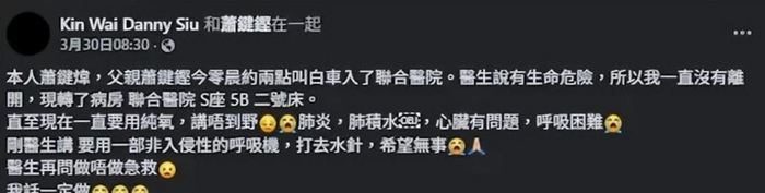 萧键铿的儿子萧键炜在社交平台上公布了父亲去世的消息。 他用“老爸毕业了”来形容父亲的离去,并表示后续事宜会再告知大家。 就在上个月底,萧键炜还透露父亲因肺炎、肺积水入院,同时伴有心脏和呼吸问题,需要使用无创呼吸机维持生命。