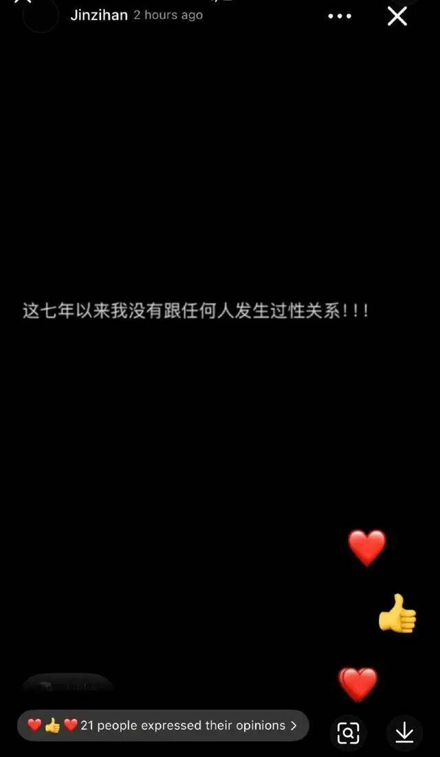 随后,她单独发布动态强调:"这七年以来我没有跟任何人发生过性关系",明确否认性行为及衍生谣言。