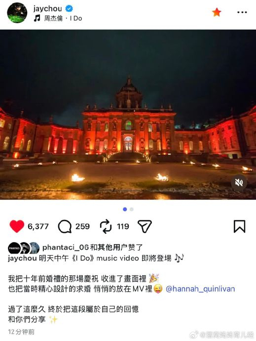 MV核心画面为2015年求婚现场全程实拍素材,非补拍或演绎。镜头捕捉到昆凌从懵懂、落泪到点头答应的真实反应,以及周杰伦为她披外套、整理裙摆的细节。穿插两人2015年同一古堡举办的婚礼片段:昆凌戴钻石皇冠、穿拖尾婚纱步入礼堂,周杰伦金丝刺绣西装相伴,马车入场与烛光派对交织,形成“求婚→婚姻”的时空闭环。