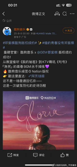 - 商业布局:2025年8月,她与QQ音乐、酷狗音乐完成版权续约,被解读为G9发行的前置动作;