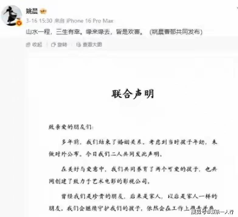 2026年3月16日下午,演员姚晨和摄影师曹郁在各自的社交账号上,同步发布了一份联合声明。声明里说,他们“多年前”就已经结束了婚姻关系,考虑到当时孩子年幼,所以没有对外公布。声明用“山水一程,三生有幸。缘来缘去,皆是欢喜”来形容过去,并承诺未来会以“家人一样的朋友”身份,继续共同守护孩子,在工作上也会携手并肩。