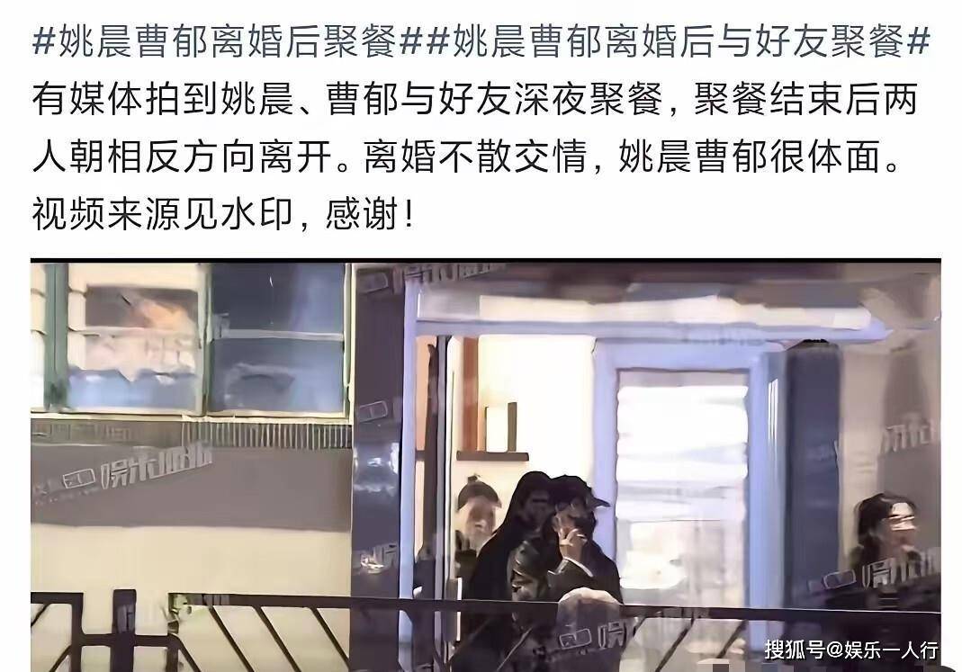 4月18日,姚晨与曹郁在宣布离婚33天后,首次被媒体拍到在私下里同框的画面。当晚,他们与朋友一起在深夜聚餐,餐后两人各自分开,整个过程流畅自然,毫无尴尬的迹象。从曝光的画面来看,聚餐结束后,姚晨和曹郁并没有一起离开,而是朝着不同的方向走去。