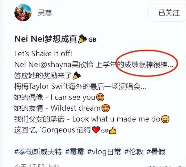 8月30日,知名男星吴尊发布了一条充满了对女儿Nei Nei(吴欣怡)的关爱、骄傲和他们父女情的动态,并晒出一组和女儿的照片,透露Nei Nei上学年的成绩“很棒很棒”,所以奖励带她去看Taylor Swift的海外最后一场演唱会!引发不少网友的围观和热议。