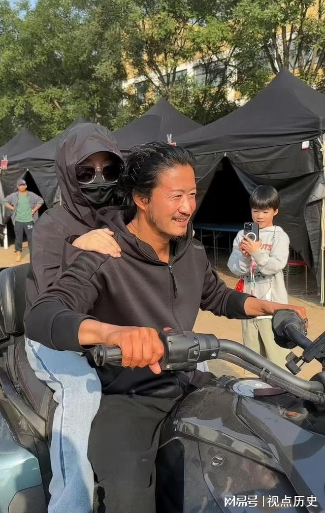 吴京开摩托给谢楠庆生,又酷又飒!镜头下的吴京身穿黑色套装,肤色黝黑,头发留着长长的卷卷发,满脸堆满笑容,骑着大摩托男友力十足,又低调又men。而他身后的谢楠戴着墨镜,捂得严严实实的。