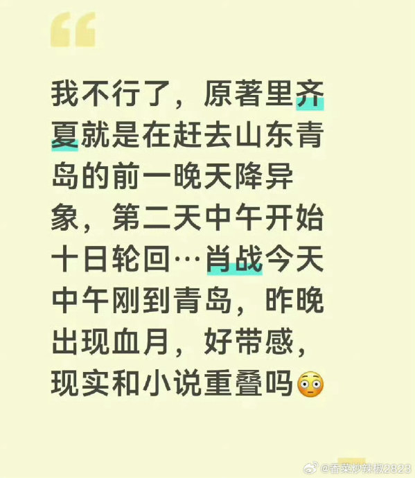 2026年4月1日深夜,青岛上空同时出现两种罕见天象:月全食形成的暗红“血月”遇上海面平流雾弥漫,整座城市笼罩在赤色迷雾中。这一景象被市民广泛记录,单条雾中公交视频点赞超30万次。巧合的是,《十日终焉》原著开篇描述的核心场景正是“血月穿透浓雾笼罩青岛,主角齐夏被卷入异空间”。更惊人的是时间线衔接——演员肖战于次日(4月2日)抵青进组饰演齐夏,与小说中“异象次日主角现身”的情节完全同步。这种现实与虚构的严丝合扣,被书粉惊呼为“终焉之地在迎接主角归位”。