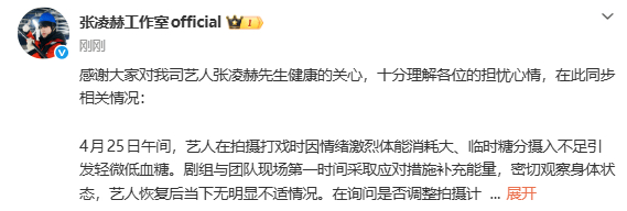 张凌赫工作室表示:“从事发初期到后续诊疗,我们时刻关注艺人状态,从未松懈。考虑到身体状况属于个人隐私,不愿过度扩散细节。”