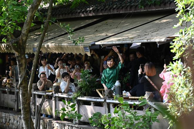 采访结束后,陈美琪换上了大家熟悉的绿色礼服,她专程赶到人民公园的鹤鸣茶社体验成都的休闲生活,不少人一眼就认出了陈美琪,有人大声喊着:小青、小青;现场还有粉丝用笛子吹响伴奏《千年等一回》……