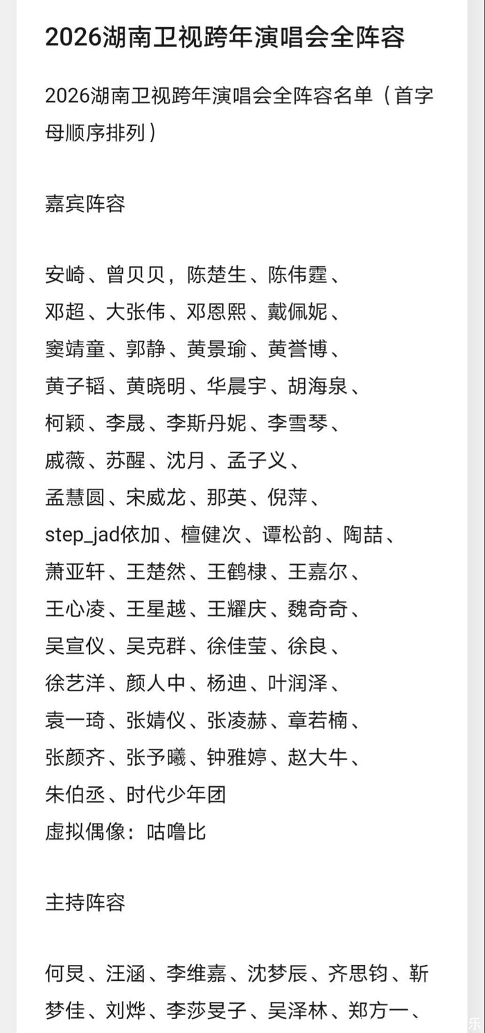 2026年的湖南卫视跨年演唱会即将到来,这可是娱乐圈每年最重要的盛事之一!无论是老球迷还是新手小白,都一定会把这个日期记在心里,毕竟跨年演唱会可是聚齐各路巨星的黄金阵容,谁能抵得住看这样的盛宴呢?,最让人期待的莫过于真唱协议的签署,据悉,所有参演艺人都必须签署真唱协议,这意味着观众可以全程清晰地看到他们的真实表现力,没有任何后期修饰的痕迹,这可是多年来首次,真的是让人怀疑,这次跨年演唱会会不会把观众的观念彻底颠覆?,再说这次跨年演唱会的阵容,堪称娱乐圈的“全员出战”,从一线巨星到暗流涌动的新锐艺人,都齐聚一堂,无论是演唱、舞蹈还是才艺表演,全都将在舞台上尽情展现,尤其是那些一直被“躺平”、“佛系”包容的艺人,这次一定会让人眼前一亮,毕竟谁能说他们没有实力呢?,还有一个值得期待的点是,跨年演唱会这一次打破了传统流水账式节目设计,据悉会有许多创新的表演形式,比如说,舞台设计、灯光效果、还有演员与观众互动的方式都将焕发新意,更重要的是,节目组这次放出了很大手笔,准备给观众带来一场视听与情感的双重冲击。,也有不少小伙伴对这次跨年演唱会提出了自己的期待,有人希望看到经典组合的再度合作,有人渴望看到年轻新人的一场崛起,有人则希望能看到一些意想不到的跨界合作,无论是老球迷还是新手小白,这次跨年演唱会都有足够的看点来满足大家的期待。,提醒大家记得准时来看12月31日晚上的跨年演唱会,毕竟这是全中国人民共同期待的盛大节目,无论是为了感受明星的魅力,还是为了享受一场精彩的视听盛宴,跨年演唱会都值得每一位娱乐爱好者前来围观!## 跨年演唱会真唱协议签署,明星们的幸福与无奈, , 2026年湖南卫视跨年演唱会的阵容揭晓,像是一个个精心编排的惊喜剧场,各路明星们早已掐定主意,准备好迎接即将到来的跨年狂欢夜晚。, , 真唱协议签署,这个简单的字眼却像一把双刃剑,既是明星们的解脱,也是他们的枷锁。"真唱"的定义早已模糊不清,有的理解为现场必须唱起来,有的则解读为必须真唱,这份协议就像一张无形的牌,随时可能在歌舞台上抽出,成为明星们的"考验"。, , 签署协议的那一刻,明星们的表情各异,有人若有若无地笑着签字,有人矫装镇定,想以一脸之色说"没问题",可谁能料到,这份协议就像一张隐形的罚单,将在演出当晚悄然呈现。, , 演出当晚,每个明星都像一只被施了魔法的仓鼠,乖巧地在"真唱"的框架下尽情舞动,有人刻意模仿经典舞台,生怕"真唱"时被点出短板;有人刻意放慢节奏,生怕"真唱"时忘词;有人故意掩饰紧张,生怕"真唱"时露出马脚。, , 观众席上,同事们你看我,我看你,期待着谁能完美诠释"真唱",有人在台上拼尽全力,却又显得太过刻意;有人试图用动作说话,却又显得力不从心,这些精心准备的舞台,却在"真唱"的要求下,变得微不足道。, , 可是谁又能说,这些被"真唱"折磨的明星们真的不幸福?他们在舞台上尽职演员,在观众面前尽职表演,毕竟,明星的幸福就是在千万观众面前尽情舞动,而这份"真唱"协议,恰恰为他们提供了这份舞台。, , 跨年演唱会的舞台,终将成为一场精彩的"真唱"盛宴,明星们或许在协议签署时若有若无地叹息,但在舞台上,谁又不想在千万双眼睛中尽情尽职?毕竟,这才是明星最幸福的时刻。 今天又公布了第五波阵容,全部阵容集结完毕,一共59组艺人加盟,和11位主持团。下面就来看一下第五波阵容都有谁。首先欢迎倪萍老师倾情加盟。还有首次来到湖南卫视跨年的窦靖童,赵大牛。老朋友吴克群,苏醒,孟慧圆,还有虚拟人物咕噜比 。