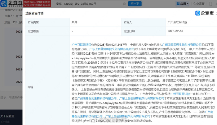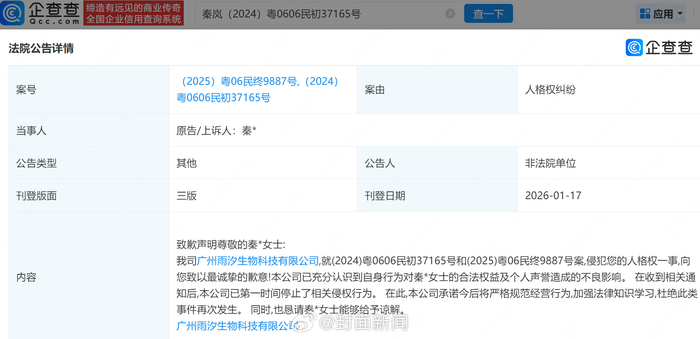 企查查APP显示,今年秦岚已起诉多方侵权,案由包括网络侵权责任纠纷、人格权纠纷。今年2月,法院公告其与广州南嘉医药生物科技有限公司、广东上影蓝鲸影视文化传媒有限公司网络侵权责任纠纷一案民事判决书,两被告被判公开道歉并赔偿秦岚赔偿经济损失8万元,判决生效后,被告拒不道歉,秦岚申请强制执行。此前,广州雨汐生物也曾因侵犯秦岚人格权公开致歉。