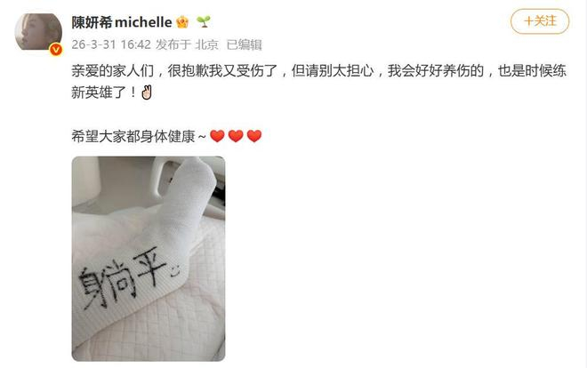 就在工作室发布声明的同一天,陈妍希本人也在个人社交账号发文向粉丝报平安。她的语气显得颇为轻松:“亲爱的家人们,很抱歉我又受伤了,但请别太担心,我会好好养伤的,也是时候练新英雄了!” 文末还不忘提醒大家注意身体健康,并配上了一张“躺平”休息的照片。