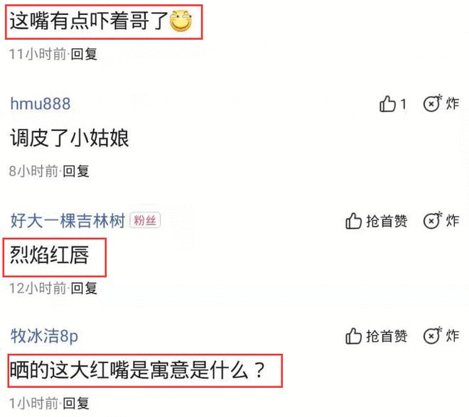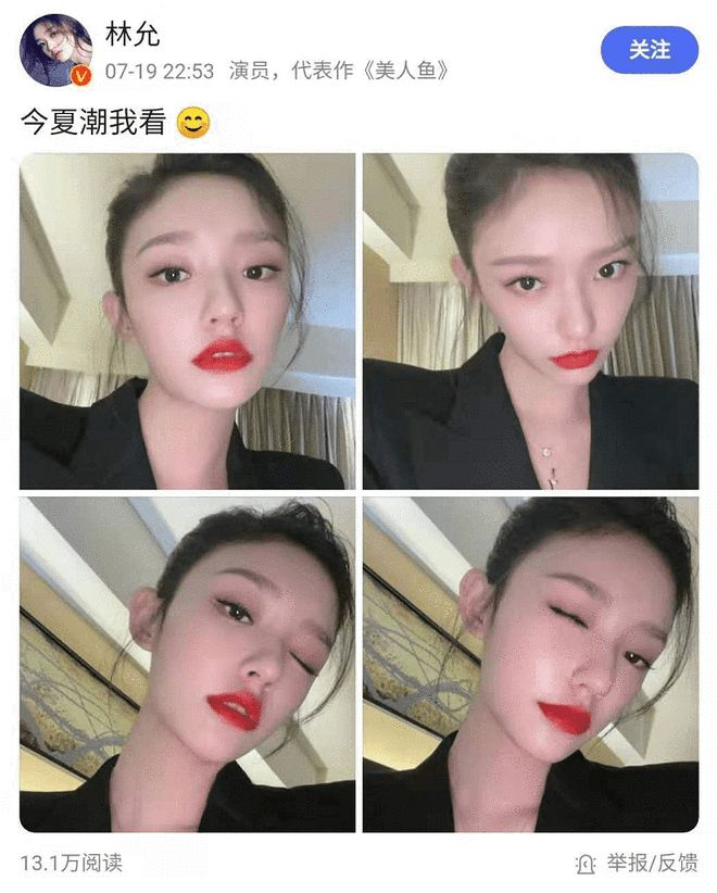 林允晒出四张自拍照,除了自拍技术引起热议以外,还有她的烈焰红唇也引起了网友们的热议,有一位网友在评论区留言,“这嘴有点吓着哥了”,还有一位网友在评论区留言,“晒的这大红嘴的寓意是什么?”,林允的烈焰红唇成了网友们关注的焦点。