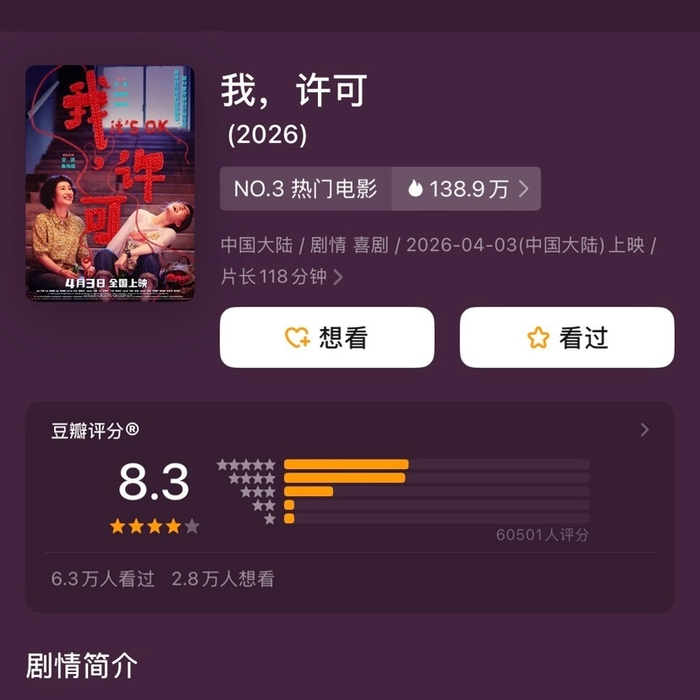 #文淇你新的代表作来了##文淇新的代表作来了# 《我,许可》豆瓣评分8.3,这是2026年第一部评分过8的国产院线电影。陈文淇你新的代表作来了!