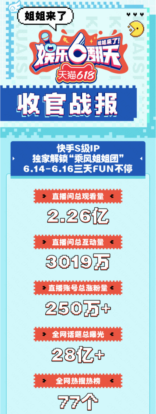 6月14日至6月16日,由天猫618独家冠名的《娱乐6翻天》——姐姐来了在快手重磅开播,为大众献上一场欢笑与感动齐飞、梦想与鼓励同在的“浪姐”直播盛宴。乘风见证人黄晓明与李莎旻子、谢娜、吴优、凯丽、李彩桦、龚琳娜、许靖韵、贾静雯、刘雅瑟、霍汶希十位姐姐一同现身快手直播间,与闺蜜自然“互怼”,与老铁实时互动。经过为期3天的直播,最终直播间总观看量突破2.26亿,直播间总互动量超3019万,并相继创下全网热搜热榜77个,引发广泛热议。