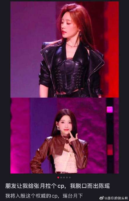 两人初舞台造型意外形成"发色与对方服装同色系"的默契:陈瑶的浅金发色映衬张月银白演出服,张月的深棕发丝则呼应陈瑶咖色裙装。这种无心的视觉和谐被观众解读为"头发是彼此衣服的颜色",强化了"瑶台月下"的宿命感标签。