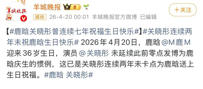 2026年4月20日,鹿晗@M鹿M 迎来36岁生日,演员关晓彤未延续此前零点发博为鹿晗庆生的惯例,这已是关晓彤连续两年未卡点为鹿晗送上生日祝福。