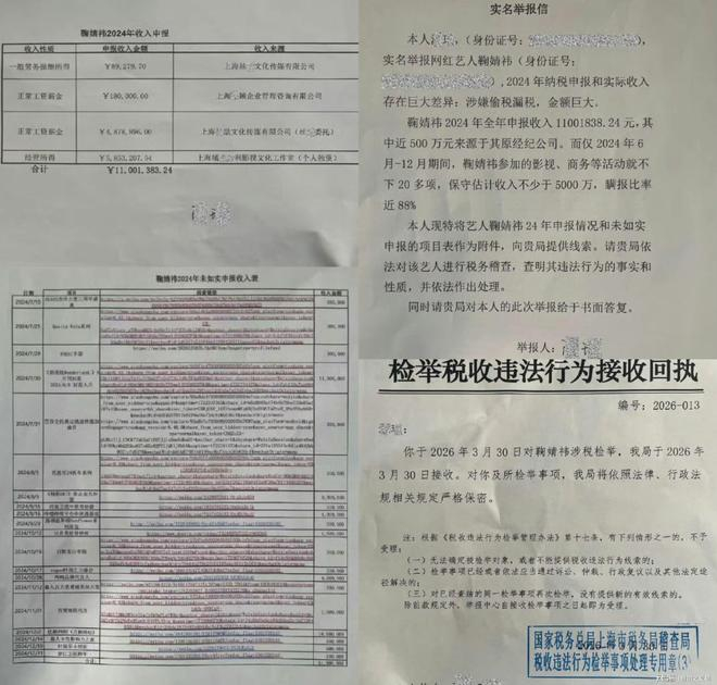 这场实名举报不是突然爆发的,而是双方拉扯了近一年的合约矛盾的全面升级,早在2024年,双方就因为经纪合约的效力问题闹上了法庭,丝芭传媒说双方在2018年签过补充协议,合约有效期要延续到2033年,但鞠婧祎方面坚决否认这份补充协议的真实性,说原来的经纪合约在2024年6月18日就已经正式到期,为了验证协议上的签名真伪,法院先后两次委托专业机构做笔迹鉴定,结果都是无法确定签名的真伪,可丝芭自己找的鉴定机构却坚称签名是真的,双方来回互诉,矛盾也越闹越僵。就在3月30日,丝芭把一整套完整的举报材料递到了税务部门,里面写得很清楚,鞠婧祎2024年全年申报的收入大概是1100万元,其中有近500万元是来自丝芭传媒,可光是2024年6月到12月这半年时间里,鞠婧祎参与的影视拍摄、商务代言、杂志拍摄等20多项公开活动,保守估算的收入就超过了5000万元,这么算下来瞒报收入的比例接近88%,为了佐证自己的说法,丝芭还附上了每一项活动的合作明细、预估收入金额,连杂志合作的相关销售数据都一并交了上去,就在材料递交的当天,上海市税务局稽查局就出具了编号2026-013的《检举税收违法行为接收回执》,明确已经受理了这次举报,正式启动稽查程序,还承诺会对举报人信息严格保密。更让人在意的是这次举报的时间点,举报的第二天也就是3月31日,刚好是鞠婧祎主演的古装剧集《月鳞绮纪》官宣定档的日子,这部剧原定4月1日正式上线,早在举报之前,丝芭就发过声明,说和鞠婧祎的纠纷没有达成任何和解,还直指《月鳞绮纪》因为侵权问题有播出风险,甚至暗示要推动剧集暂停播出,不少网友都看出来,这场举报和剧集的发行上线,根本脱不开关系。