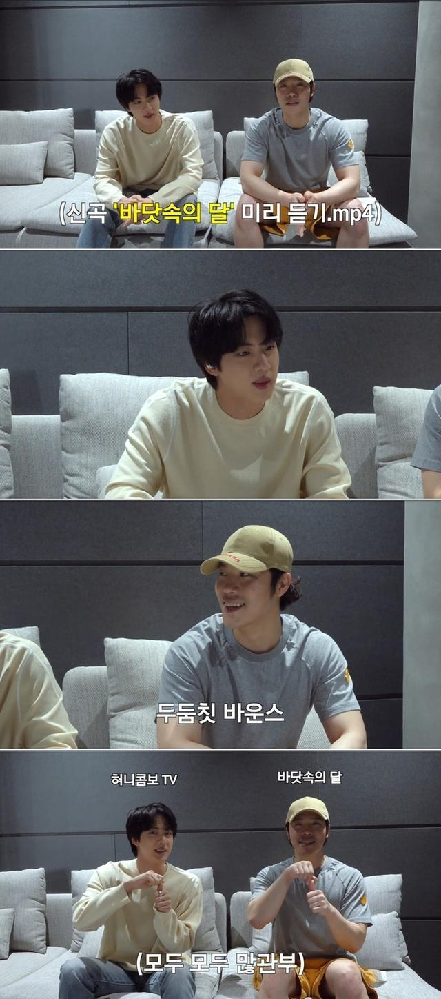 视频中,平时关系密切的两人并排坐着,在轻松的气氛中进行了交谈,Jin从一开始就夸奖道:“歌名就很好! 《大海中的月亮》”,表达了对新歌的期待。