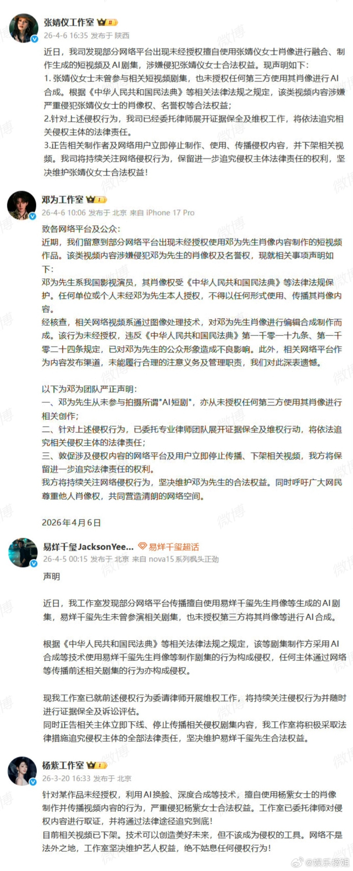 #多位艺人工作室发布短剧侵权声明# 杨紫、易烊千玺、邓为、张婧仪工作室发布短剧侵权声明。支持维权,AI侵权问题必须严肃看待!#春日心动放映季#