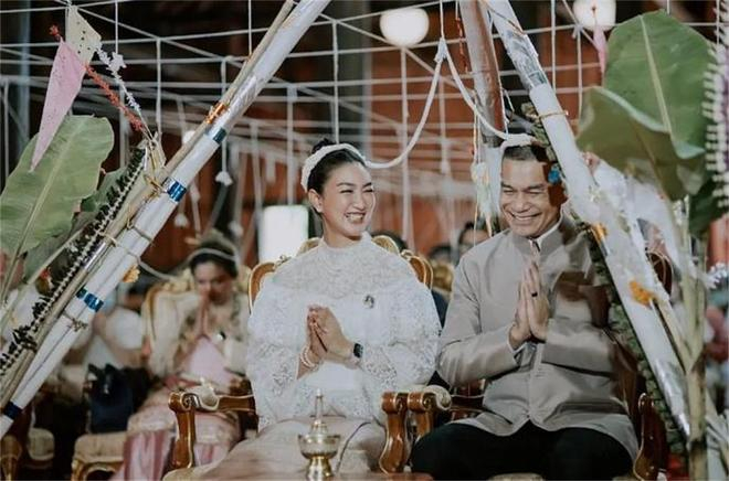 在随后的仪式上,长辈给Pancake和Mee的手上绑上了白色的绳子,并戴上花环,表示祝福这对新人百年好合。