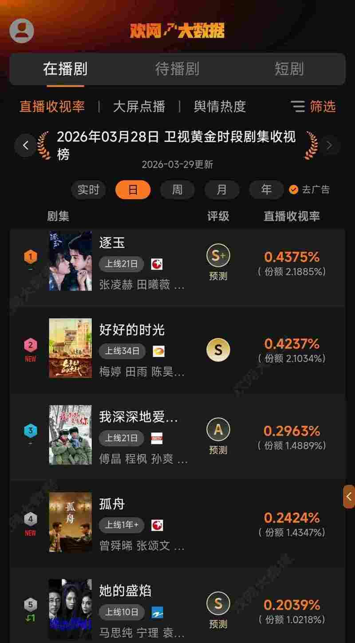 3月28日 欢网大数据【卫视黄金时段】剧集直播收视率来啦!