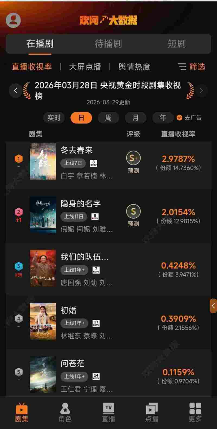 3月28日 欢网大数据【央视黄金时段】剧集直播收视率来啦!