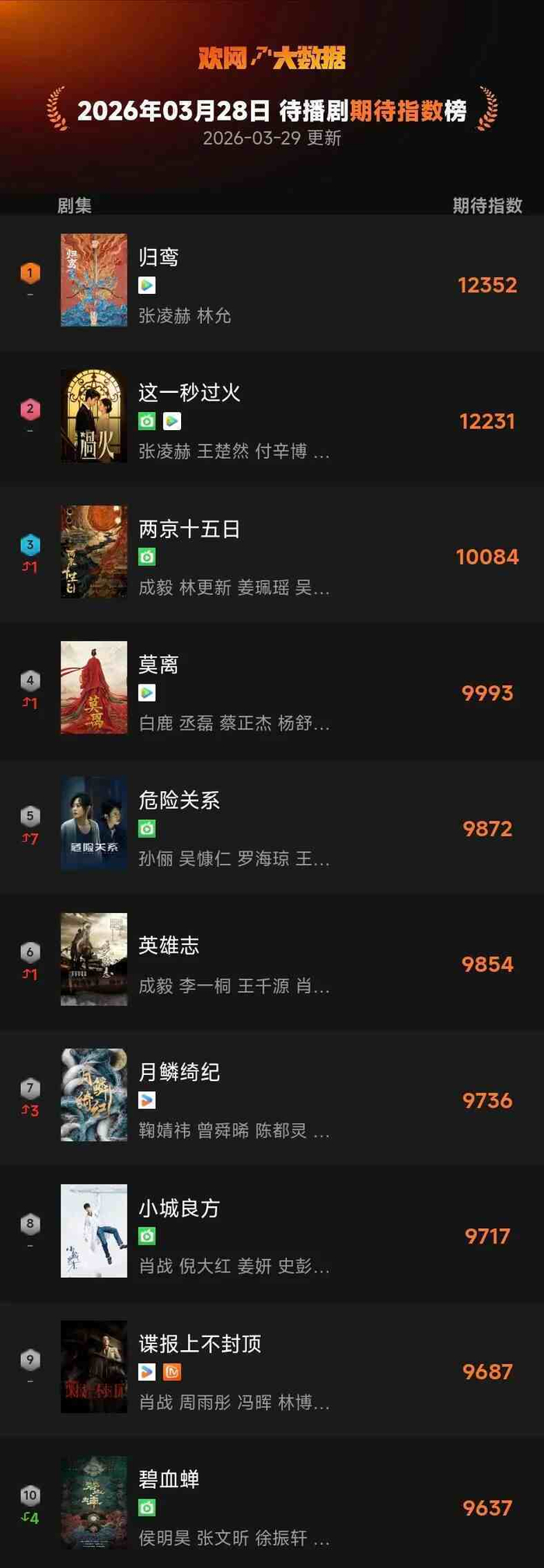 3月28日 欢网大数据【待播剧】期待指数TOP10来了!