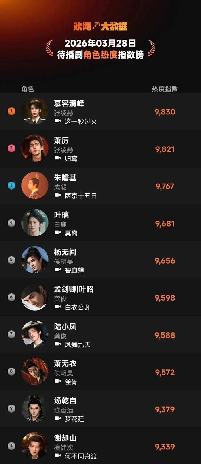 3月28日 欢网大数据【待播剧】角色热度指数TOP10来啦!