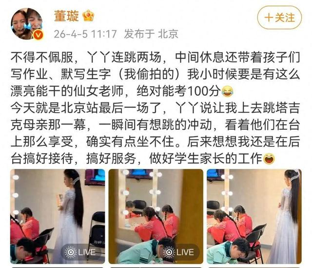 近日,演员董璇晒出视频,并配文:“不得不佩服,丫丫(佟丽娅)连跳两场,中间休息还带着孩子们写作业,默写生字(我偷拍的)。我小时候要是有这么漂亮能干的仙女老师,绝对能考100分。”