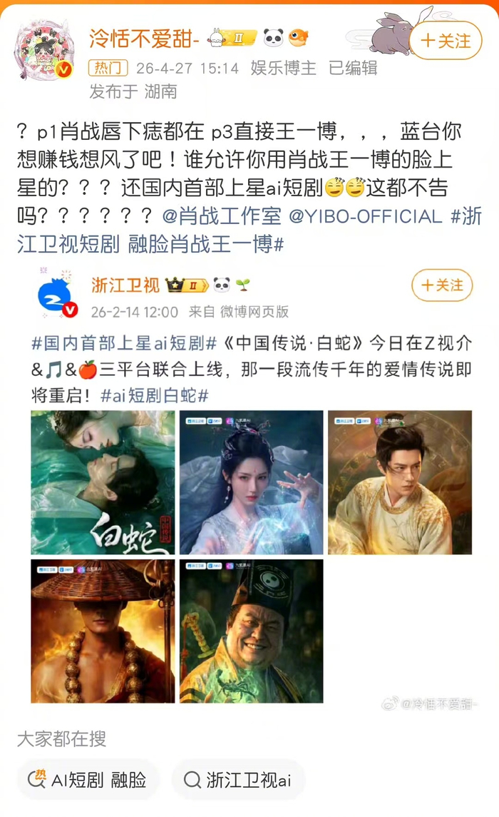 【#AI短剧疑融脸肖战王一博捞百万流量#】#AI短剧 融脸##建议不要过度依赖AI# 27日晚,在浙江卫视上星播出的ai短剧《中国传说·白蛇》被网友质疑融脸肖战和王一博,且有不少网友认为相似度颇高,引发热议。《中国传说·白蛇》自2月14日在多平台上线,并于2月17日登陆浙江卫视晚间黄金档,当时宣传为国内首部上星的ai短剧。 据当地媒体,《中国传说·白蛇》34卫视同时段收视率全国第二,全国单集收视人次超100万 。(记者 沈昭)