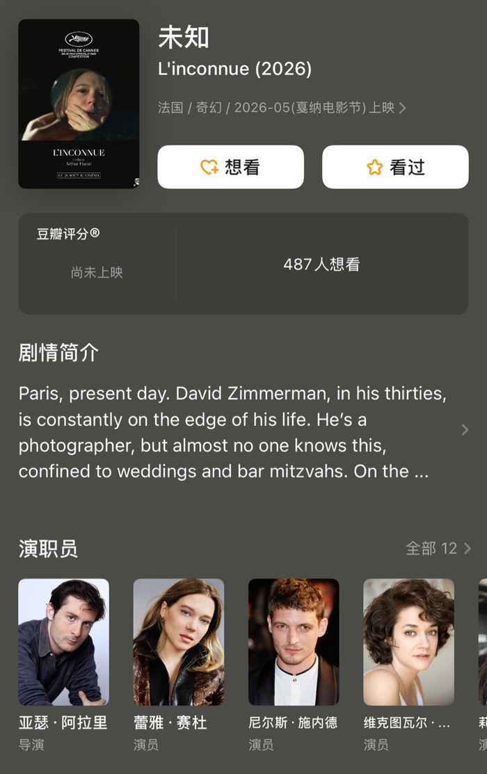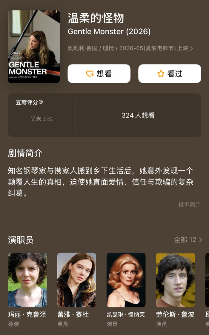 法国劳模依旧。蕾雅·赛杜两部主演电影入围戛纳主竞赛单元,分别是《温柔的怪物》、《未知》。两部都好期待。