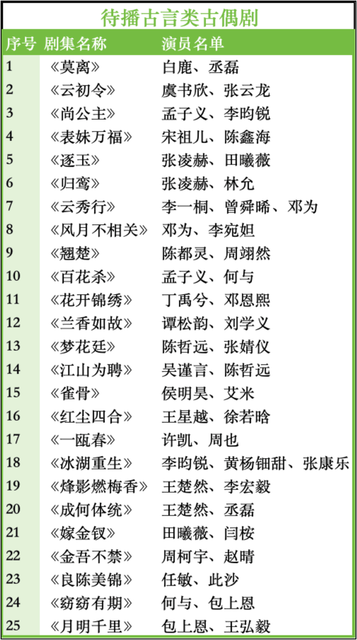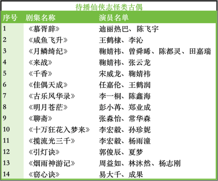 据不完全统计,待播古偶约五十部,分仙侠志怪(含超自然元素,核心是“奇幻”)与古言(无超自然元素,核心是“现实”)两类。