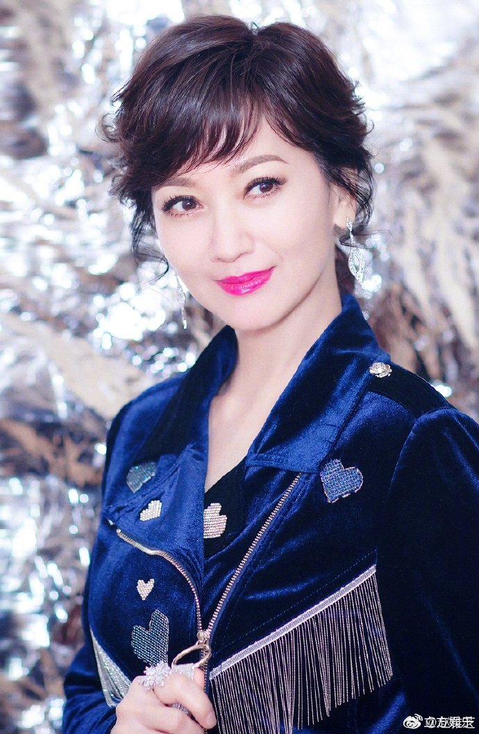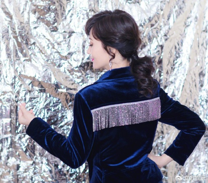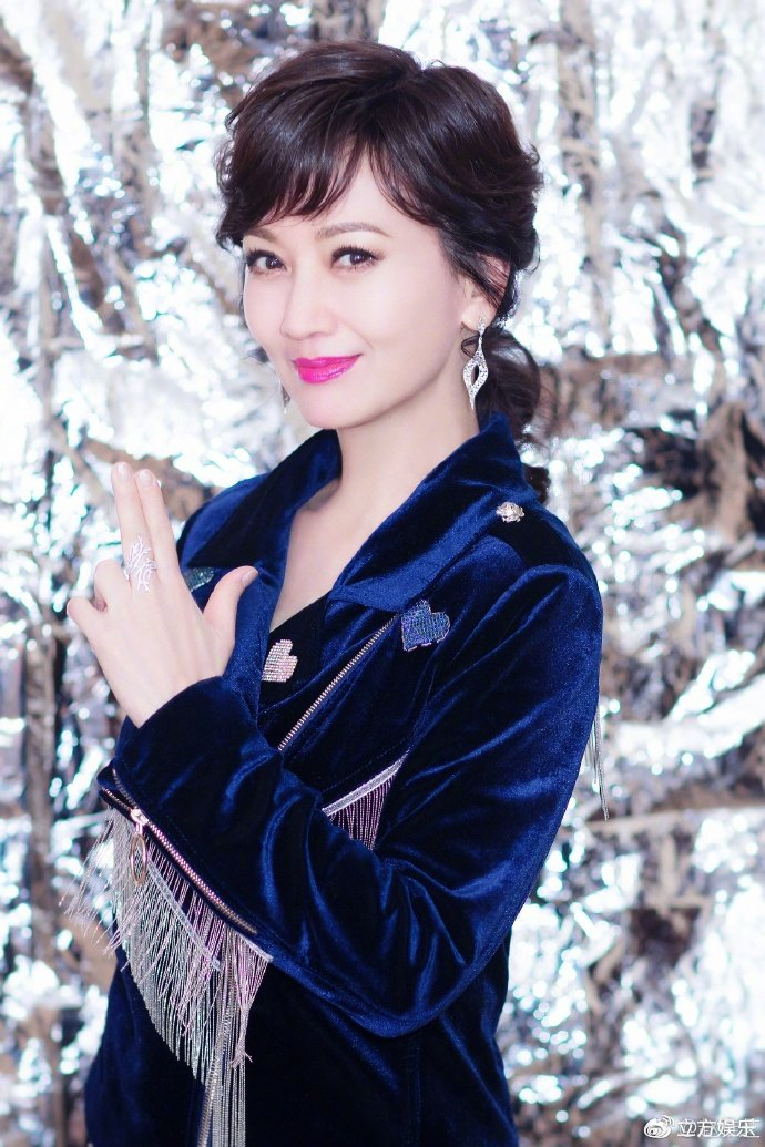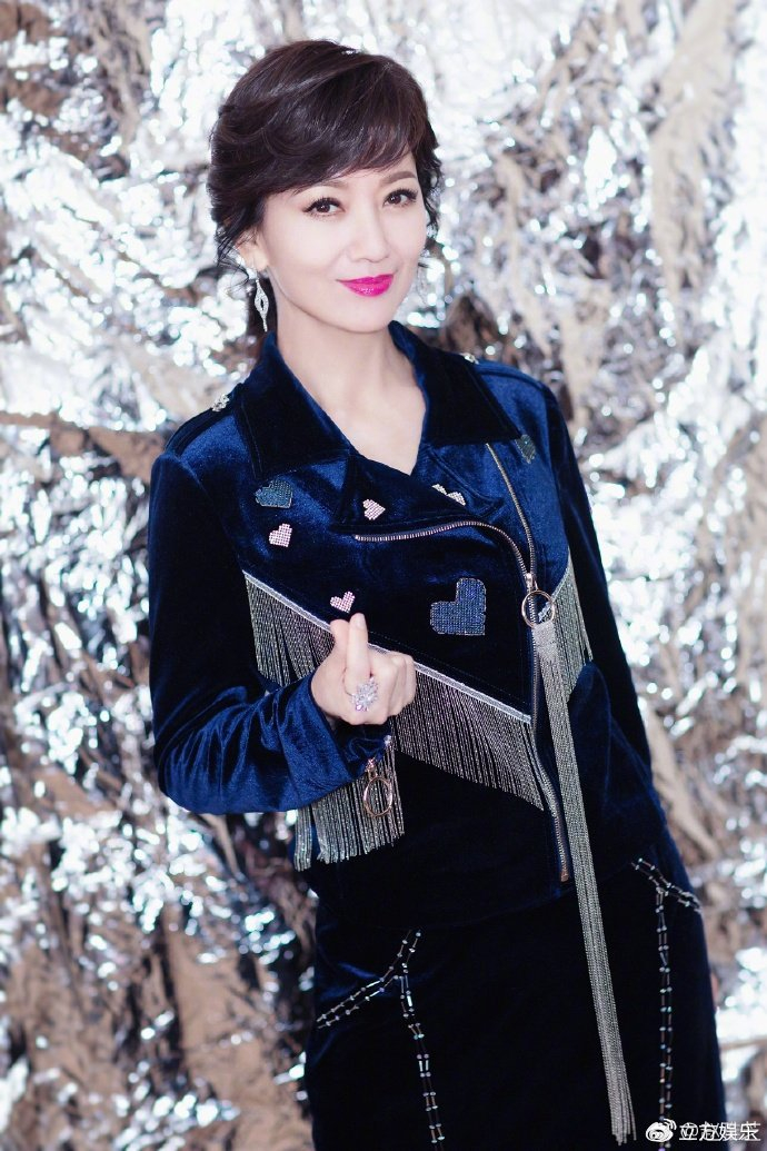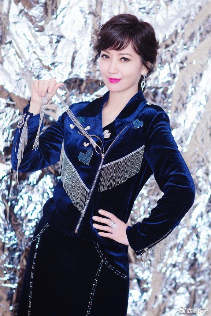 赵雅芝身着深蓝色丝绒套装,在一片银色金属质感的背景墙前摆pose,十分绚烂夺目