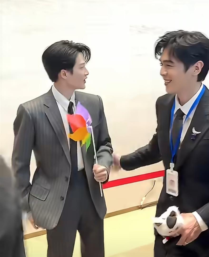 其实,檀健次的温柔细节不止于此。 在后台等候区,他还和一位采访他的小记者一起玩起了风车。 当小记者手里的风车不小心掉在地上时,檀健次很自然地把自己手里的风车递了过去,帮她解了围。 这个细微的动作被镜头记录下来,又为他赢得了一波“细心”“体贴”的好评。